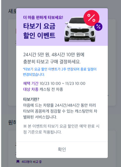 쏘카 캐스팅 같은 경우 11월 23일까지 직접 하루 또는 이틀을 타보고 구매를 결정할 수 있는 이벤트도 있습니다.
