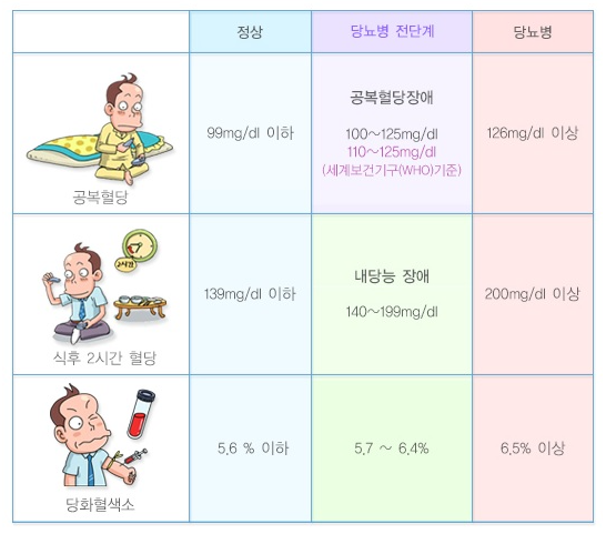 - 공복 혈당 장애(당뇨 전단계) : 100 ~ 125mg/dl