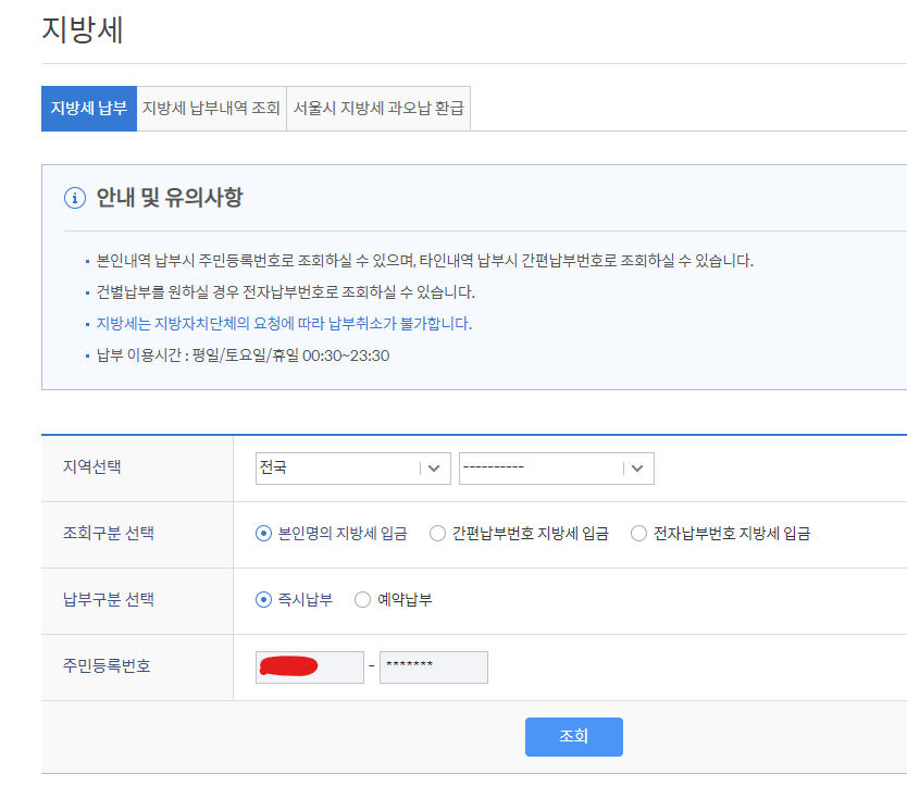 그리고 본인 명의로 되어 발급된 지방세 항목을 조회합니다.