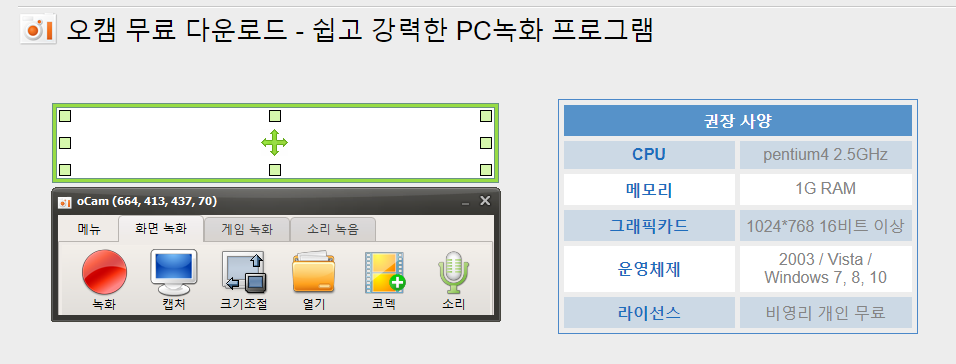 기능은 영상 녹화 및 화면 캡처 등 단순하지만, 그만큼 용량을 안타기 때문에 저사양 PC를 사용한다면 추천합니다.