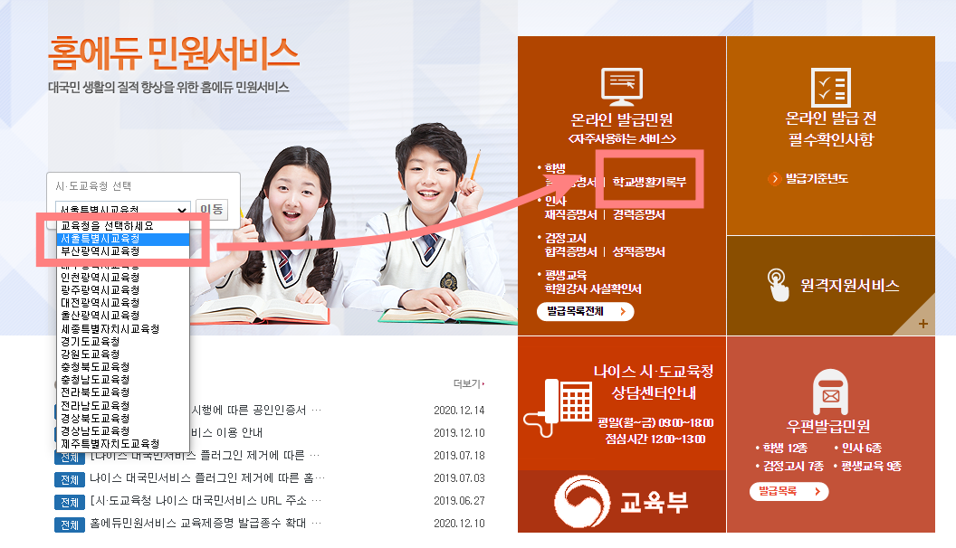 - 온라인 발급민원에서 학교 생활 기록부 선택