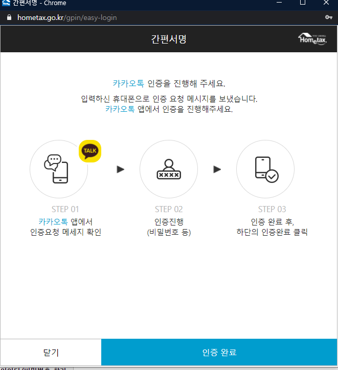 - 다시 홈택스에서 카카오톡 간편서명 로그인 시도(기존 인증 시도는 이미 만료되어서)