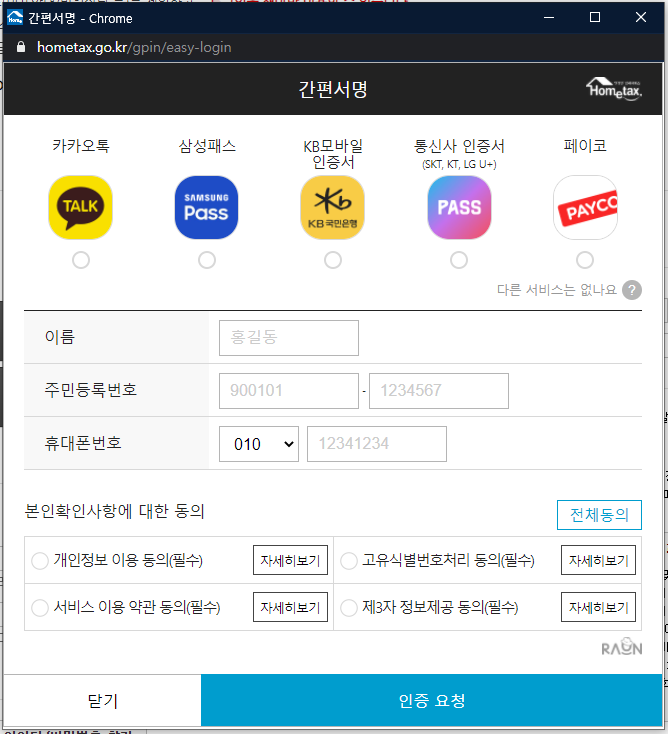 공인인증서 또는 공동인증서 없이 홈택스 로그인을 할 수 있는 기능입니다.