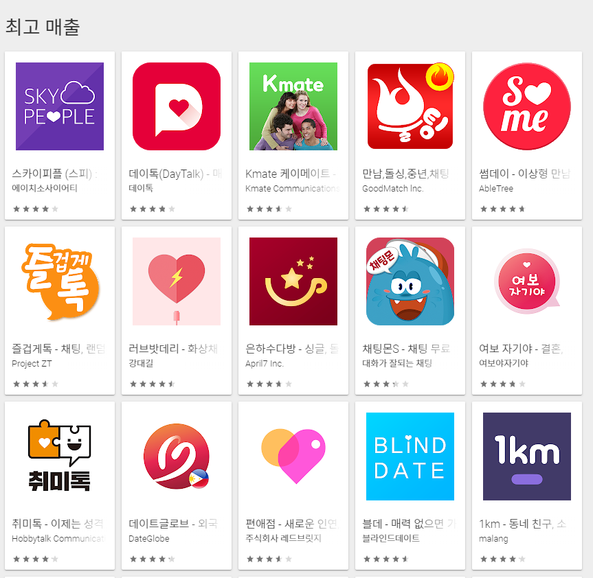 구글 플레이에서 데이팅 어플 순위로 인기 순위를 내어보았습니다.