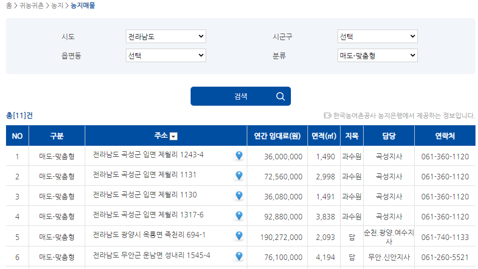 농어촌 알리미에서는 농지(논, 밭) 임대 및 매매에 대한 정보는 여전히 구할 수 있습니다.