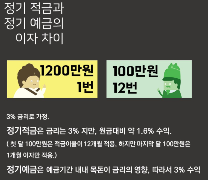 예를들어, 정기 적금으로 한달에 10만원씩 넣었을때와 정기예금으로 120만원을 1년간 예치했을때 이자는 적금 이자가 1% 이상 높다고 하더라도 정기예금의 이자가 더 많습니다.
