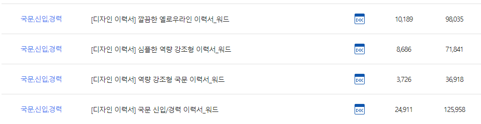 거기서 마음에 드는 기본 이력서 양식을 원하는 확장자(HWP, DOC 등등)에 맞춰서 다운 받으면 됩니다.